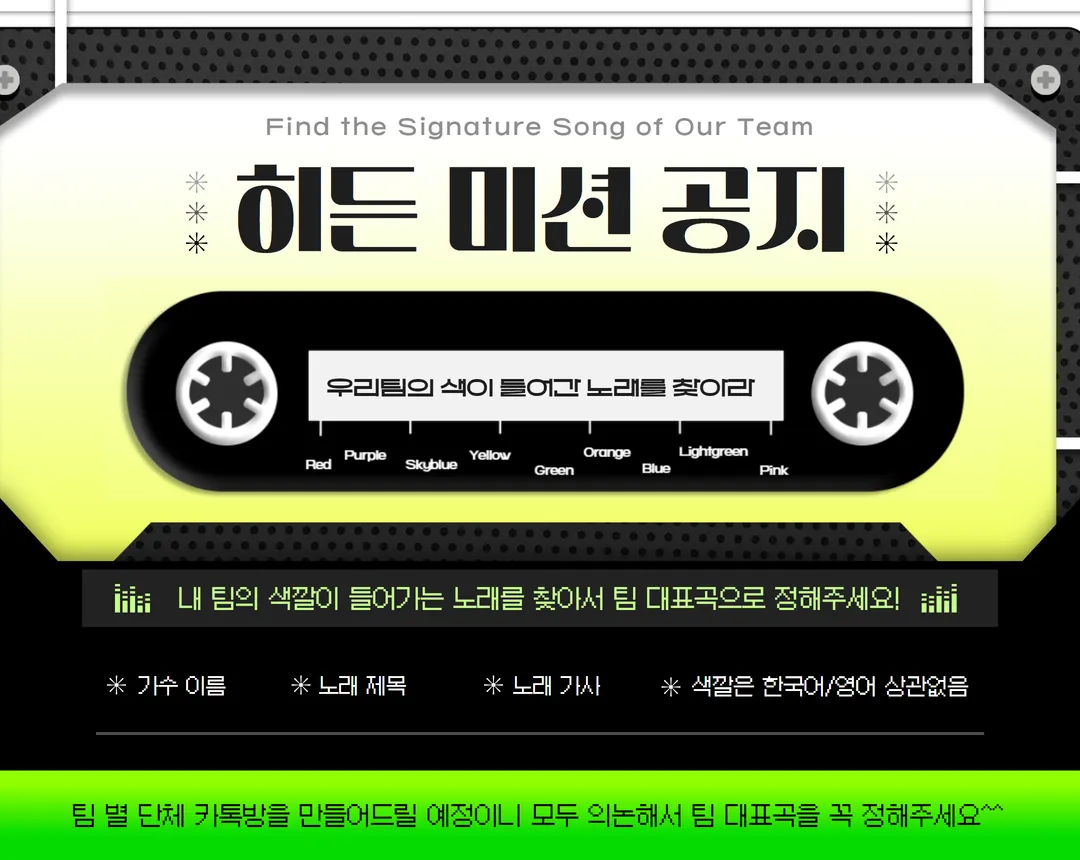 사전에 히든 미션 관련, 내 팀의 색깔이 들어가는 노래를 찾으라고 공지 해드렸었는데요!
