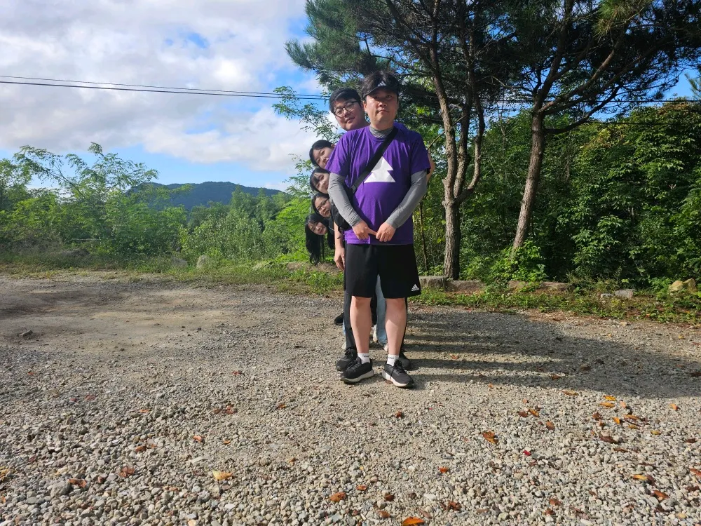 단체 사진을 남기고 싶어서 하산하는 길에 일심동체샷을 한 번 찍어 봤답니다