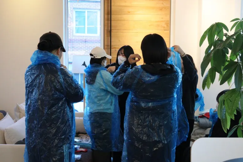 서로서로 도와 앞치마와 팔 토시까지 착용하며