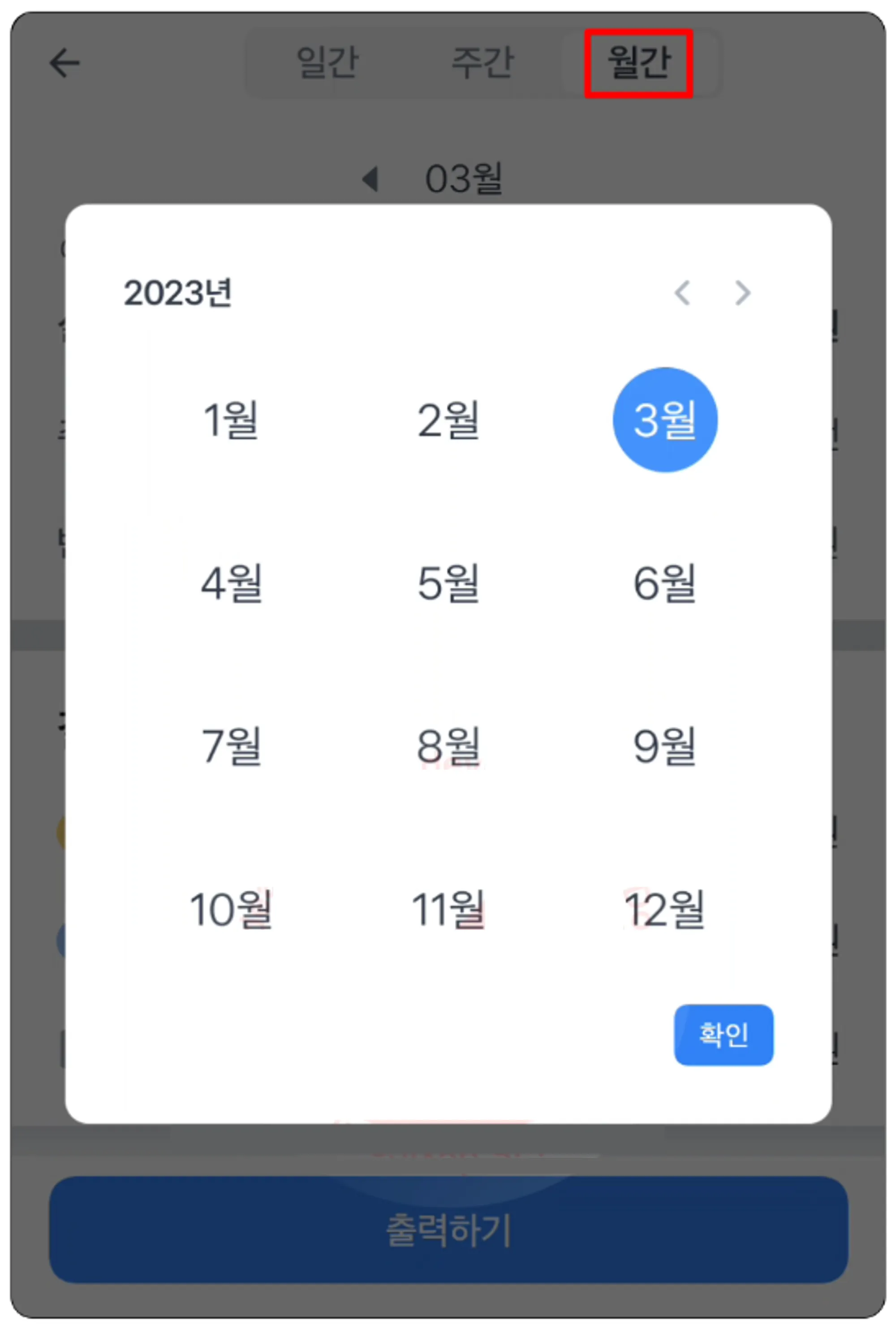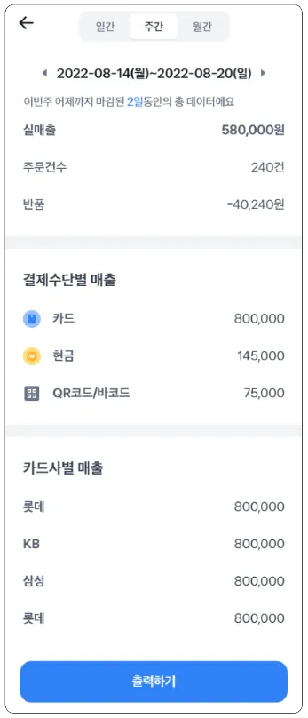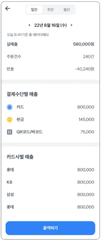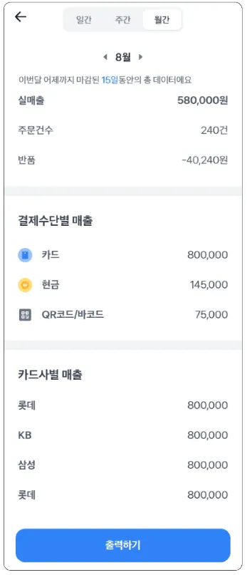 5. 하단의 출력하기 버튼을 통해 매출 리포트를 출력할 수 있어요.
