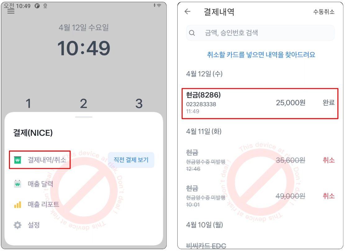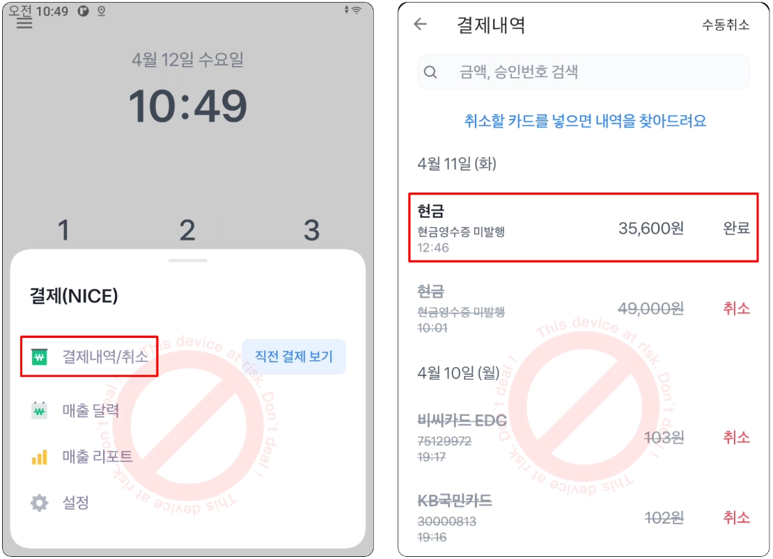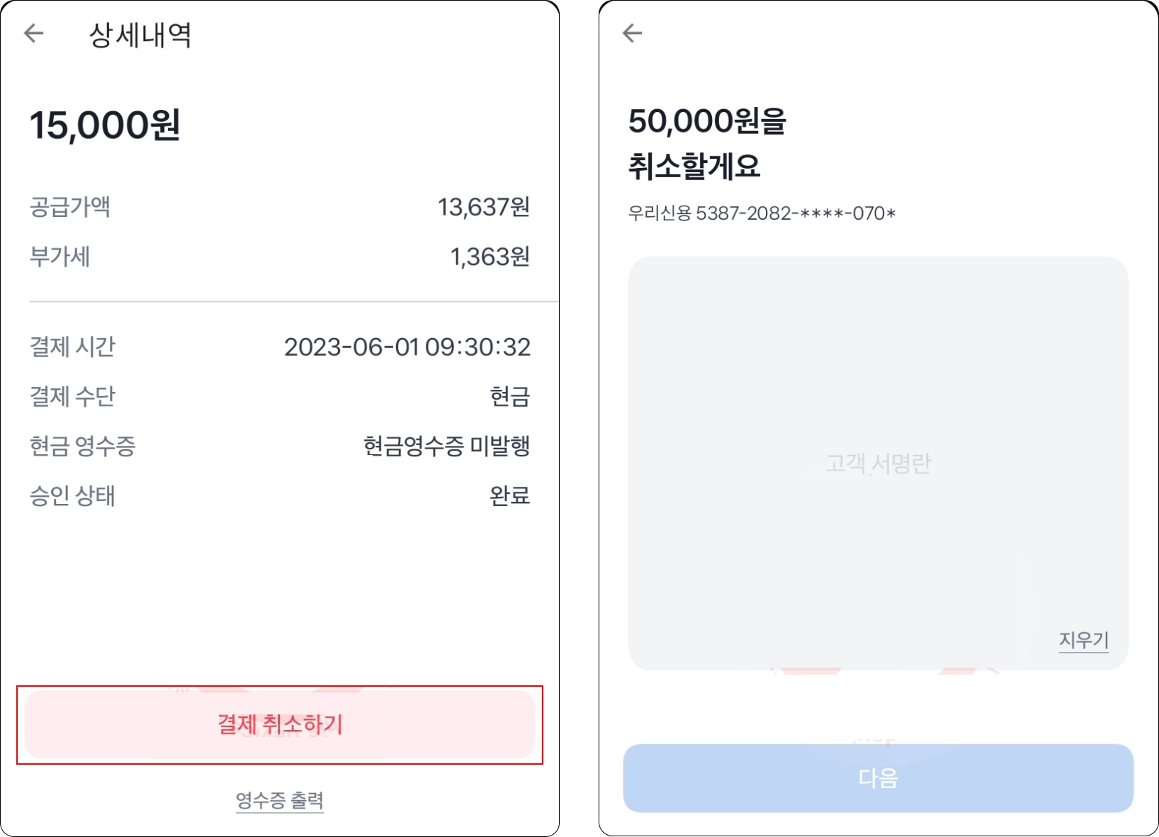 5. 50,000원 이상일 경우에만 터미널 화면에 취소 서명을 하기 위한 화면이 노출돼요.