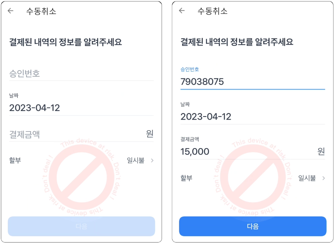 4. 결제된 내역의 정보를 수기로 입력한 후 다음 버튼을 클릭해주세요.