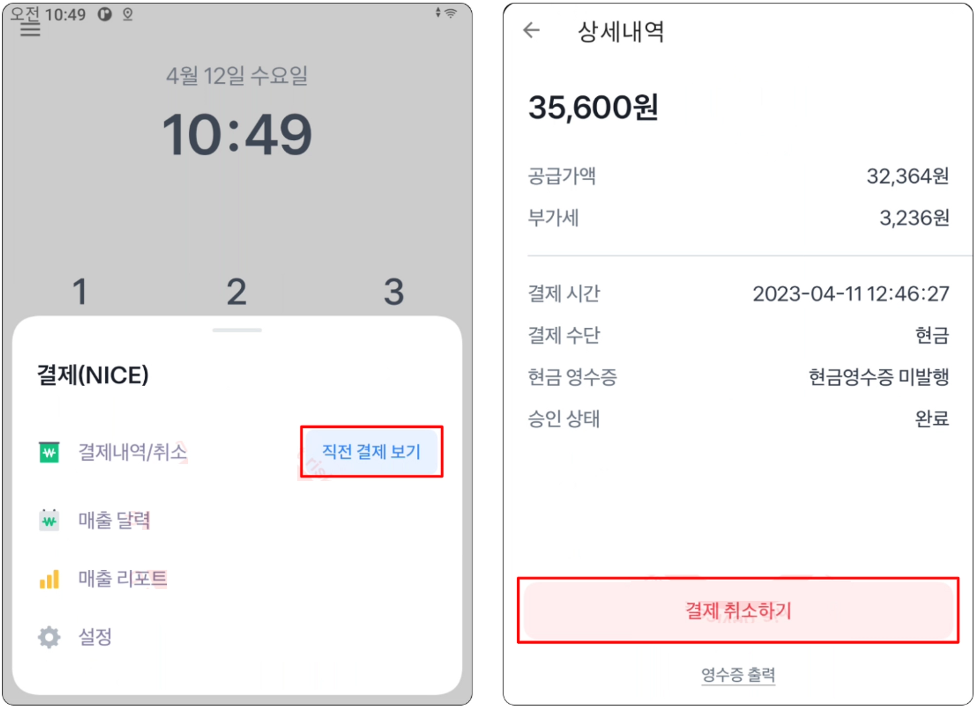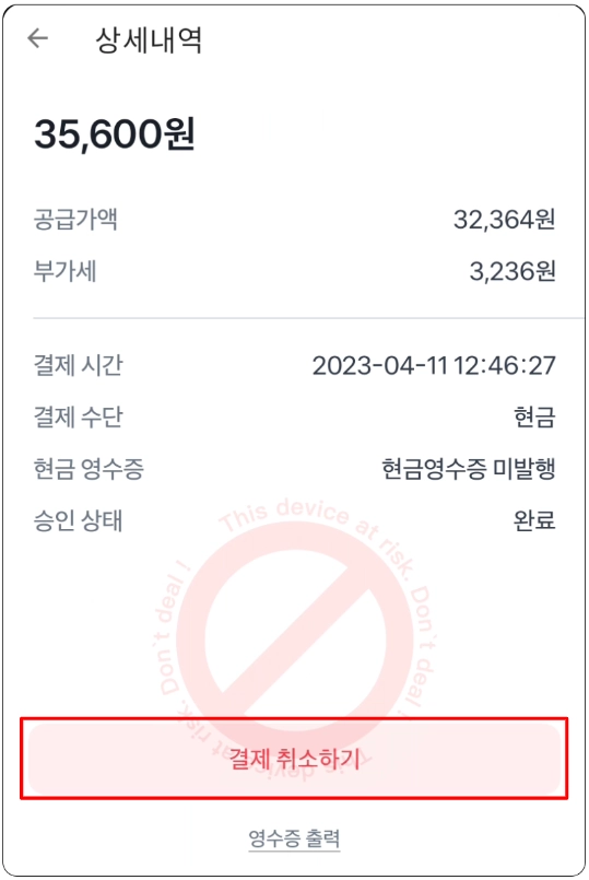 현금결제 취소 (최초 결제 시 현금영수증 발행의 경우)