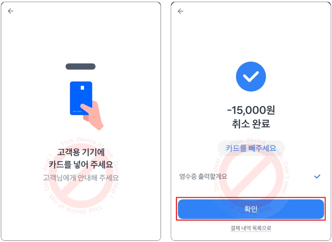 7. 서명이 완료된 후, 고객용 기기에 고객이 카드를 꽂아 결제가 취소될 수 있도록 안내해주세요.