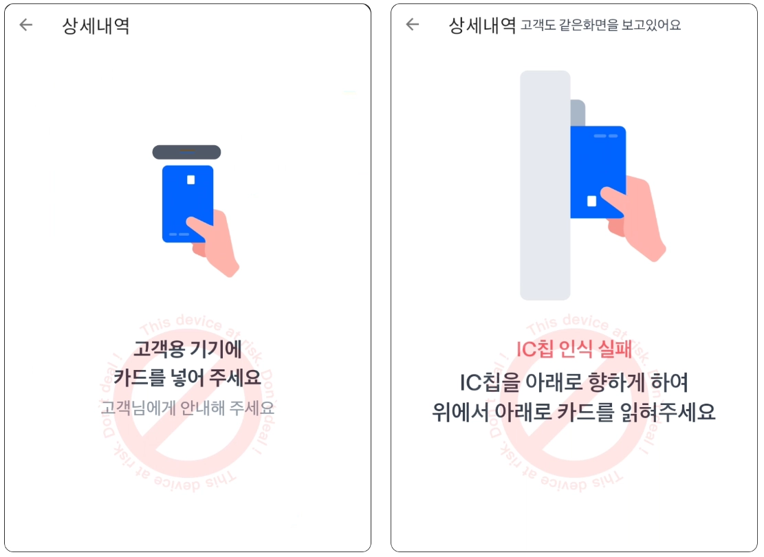 8. IC 카드인식에 실패했다면, 세로로 긁어 MSR 결제가 진행될 수 있도록 안내해주세요.
