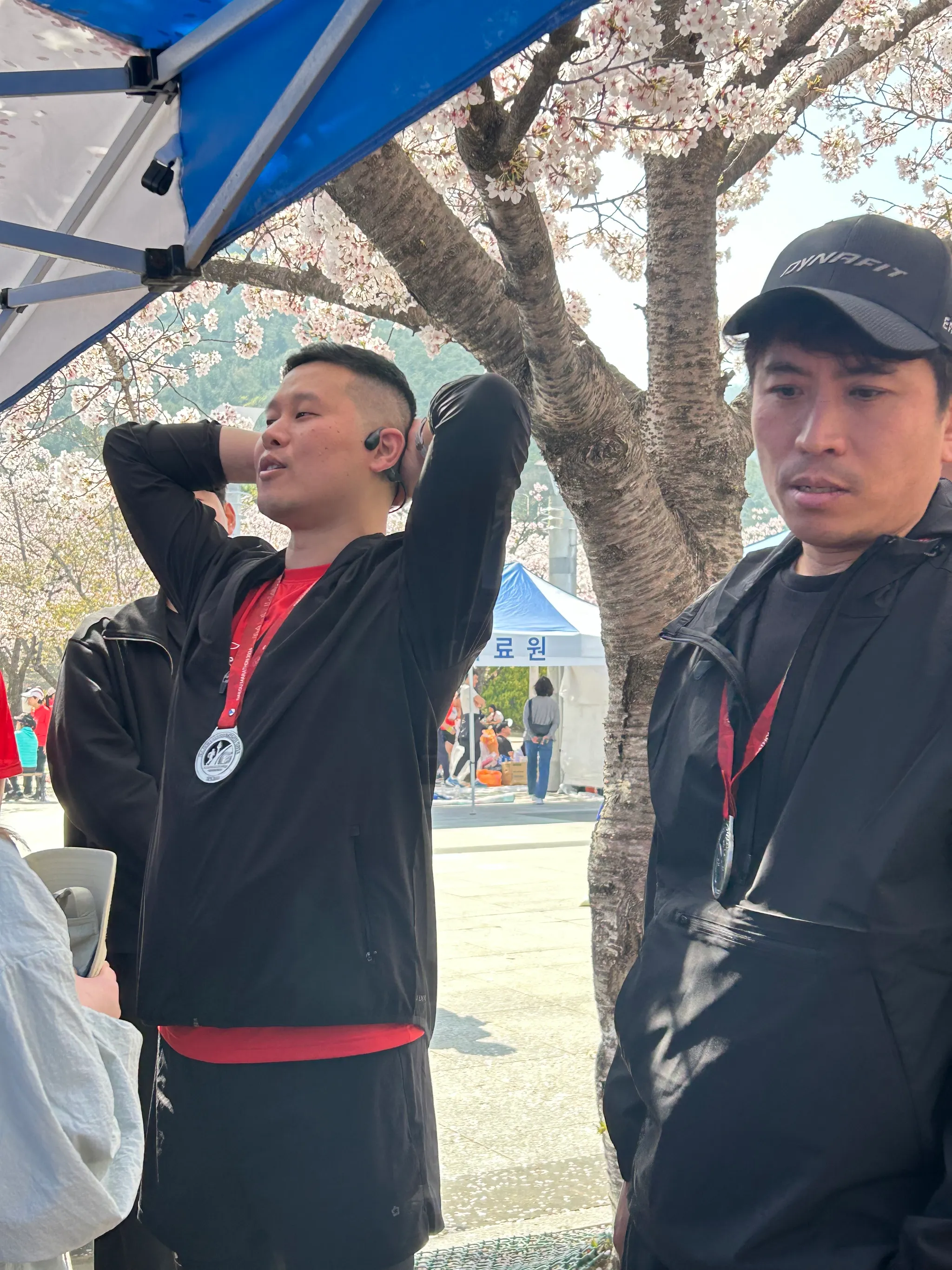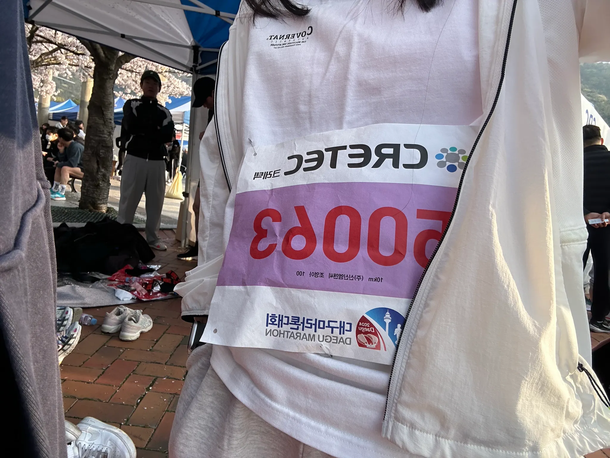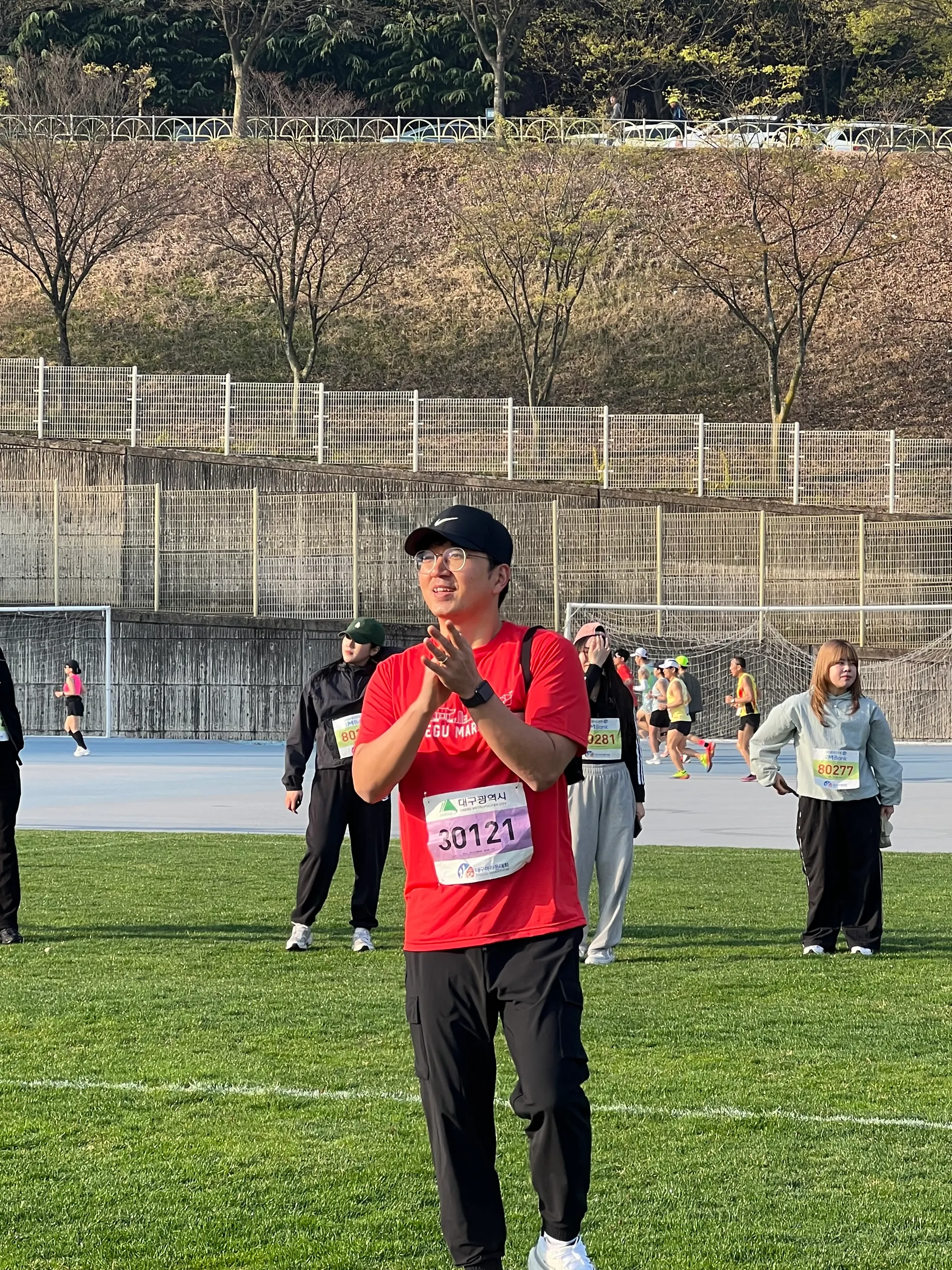 기록 측정을 위해 배번표도 딱 ! 부착하고 준비 운동 하러 고고씽