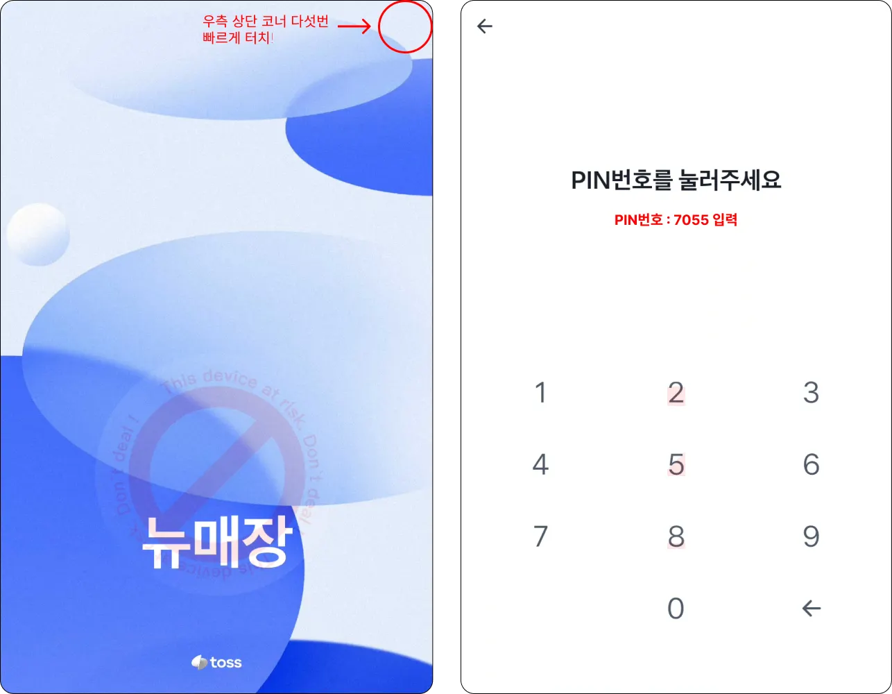 메인 화면에서 우측 상단을 다섯 번 터치한 후, PIN번호 4자리: 7055를 눌러주세요.