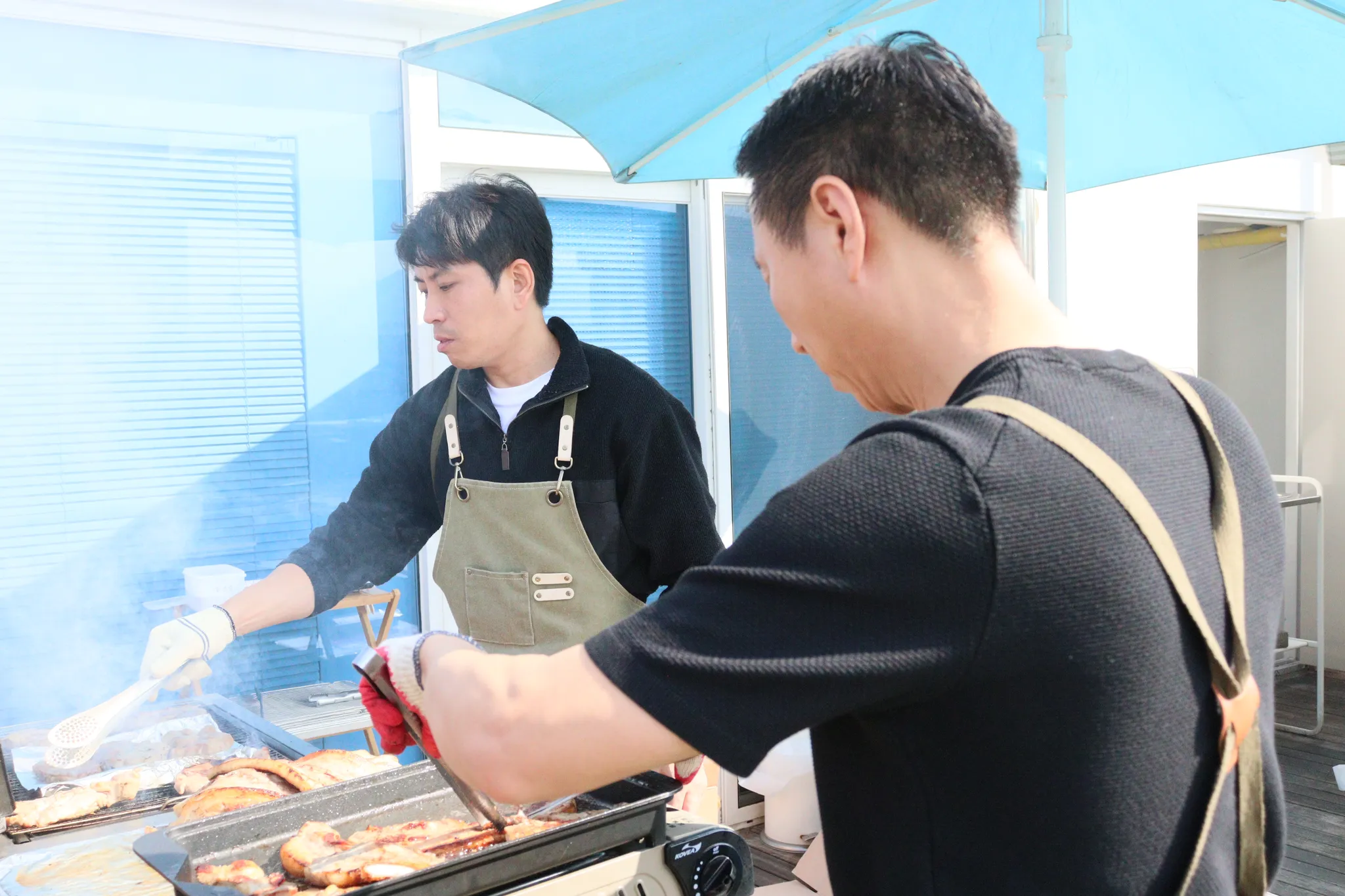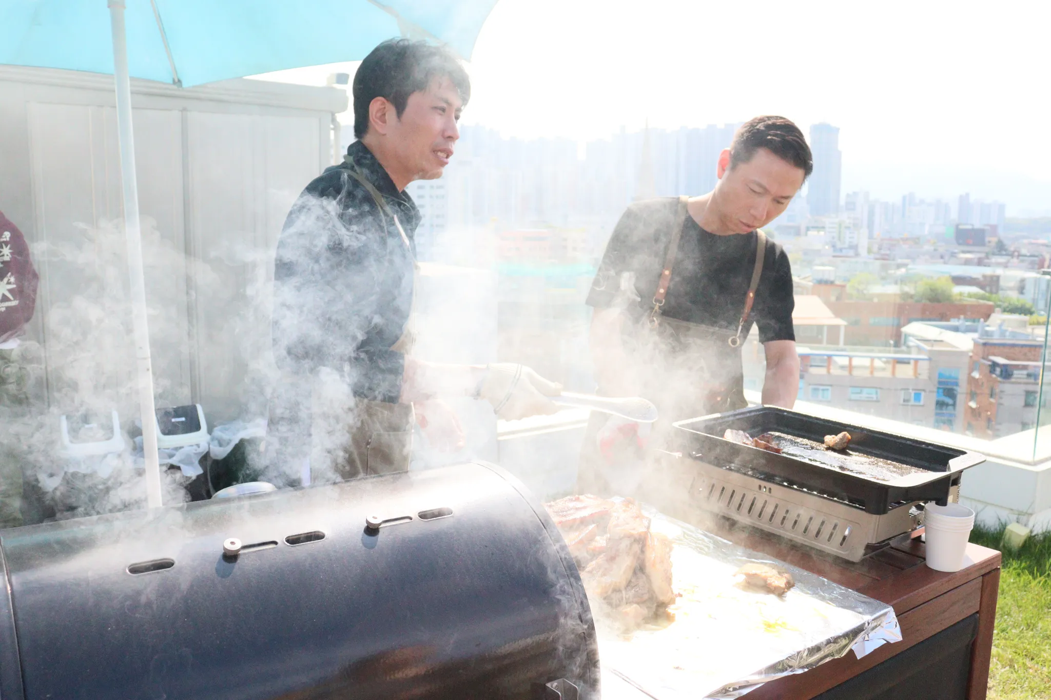 햇빛 강렬한 날씨에 연기 속에서 ,, 직원들을 위해 열심히 고기 구워주시는 모습